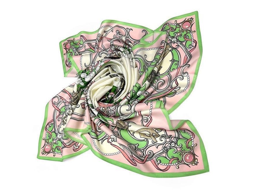 Платок «Кремль – Москва» в шелке воплощает шедевр ювелирного искусства Карла Фаберже из серии подарков для русской императорской семьи. В центре полотна расположен Успенский собор в обрамлении башен Московского Кремля. Утонченный рисунок, яркое цветовое решение и глубокий символизм дизайна платка созданы для эффектного акцента праздничного образа.