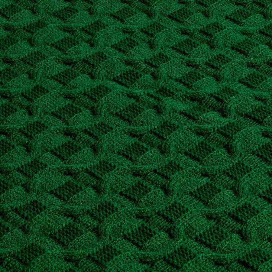 Модель: однотонный плед с фактурной вязкой, которая позволяет сделать его воздушным и объемным. Чередуя различные типы петель на гладком полотне, можно вывязать любую графику — логотип, текст, товарный знак.