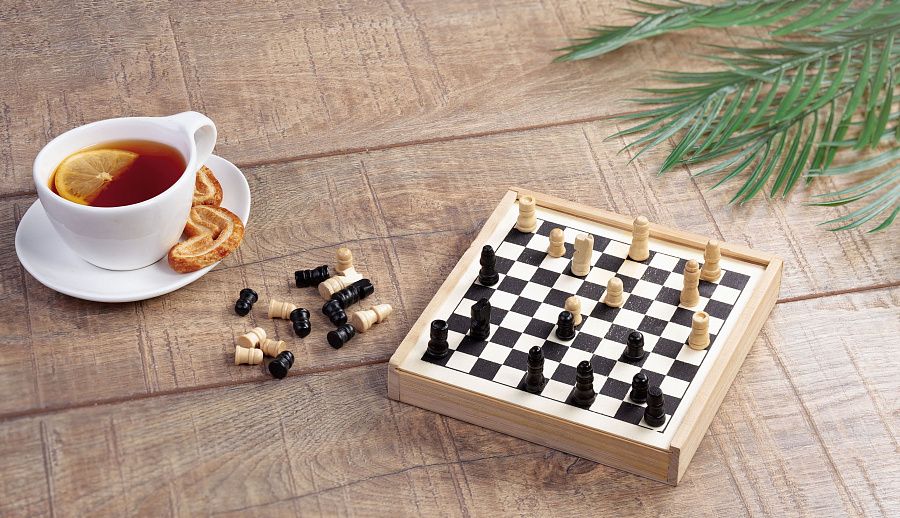 Игровое поле для шахмат и шашек нанесено прямо на выдвижную крышку футляра, обратная сторона остается чистой.