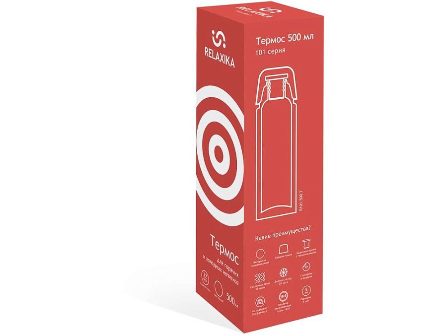 Классический термос Relaxika черного цвета с высокими показателями удержания температуры напитка для походов, путешествий, спорта и ежедневного использования. Прочные двойные стенки из высококачественной нержавеющей стали 18/8 с вакуумной изоляцией гарантируют, что ваш напиток останется холодным в течение 36 часов и горячим до 30 часов. Этот материал не только прочен, но и гигиеничен, не выделяет никаких вредных для здоровья веществ. Ваши напитки сохраняет естественный вкус и не приобретут посторонний запах.