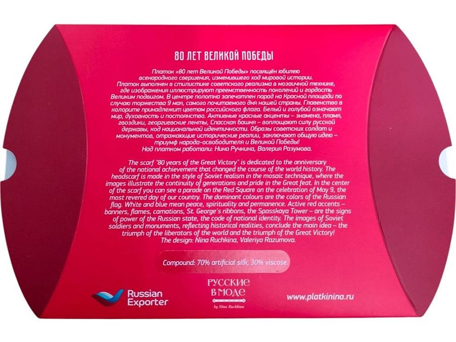 Платок «80 лет Великой Победы» посвящён юбилею всенародного свершения, изменившего ход мировой истории. Дизайн выполнен в стилистике советского реализма в мозаичной технике, где изображения иллюстрируют преемственность поколений и гордость Великим подвигом. В центре полотна запечатлен парад на Красной площади по случаю торжества 9 мая, самого почитаемого дня нашей страны. Главенство в колорите принадлежит цветам российского флага. Белый и голубой означают мир, духовность и постоянство. Активные красные акценты – знамена, пламя, гвоздики, георгиевские ленты, Спасская башня – воплощают силу русской державы, код национальной идентичности. Образы советских солдат и монументов, отражающие исторические реалии, заключают общую идею – триумф народа-освободителя и Великой Победы! Художники: Нина Ручкина, Валерия Разумова.