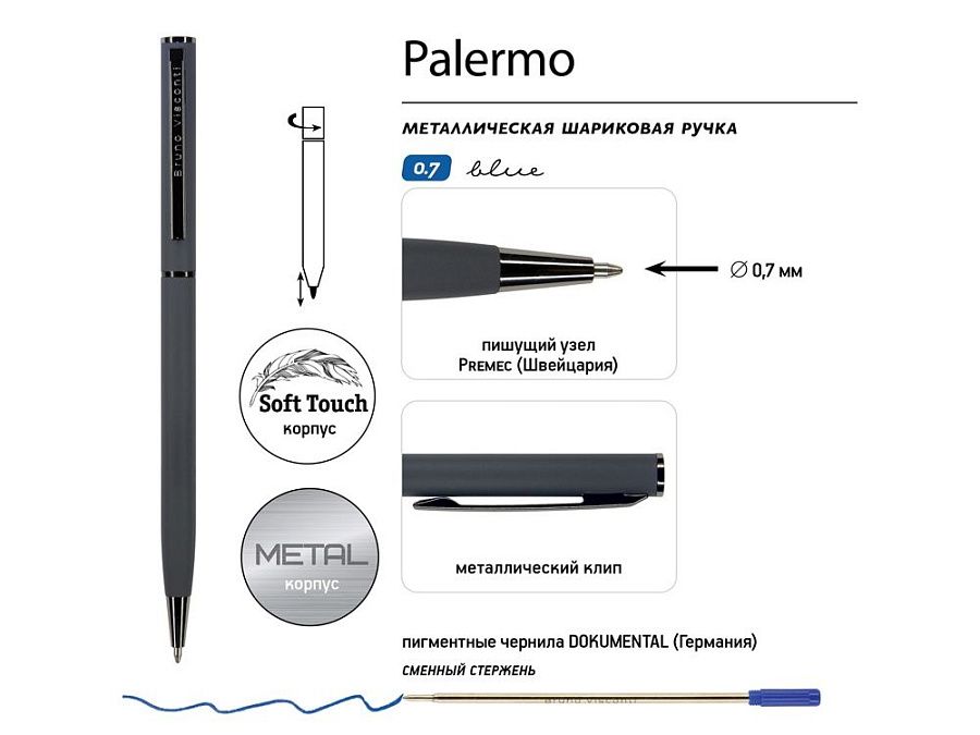 Автоматическая металлическая ручка "Bruno Visconti" серии "Palermo" однотонного цвета порадует любителей всего изящного и утонченного. Покрытие корпуса Soft Touch гарантирует дополнительный комфорт в работе с ней. Стержень легко выдвигается благодаря поворотному механизму. Синие пигментные чернила Dokumental (Германия) и пишущий узел Premec (Швейцария) обеспечивают качественное и мягкое письмо.