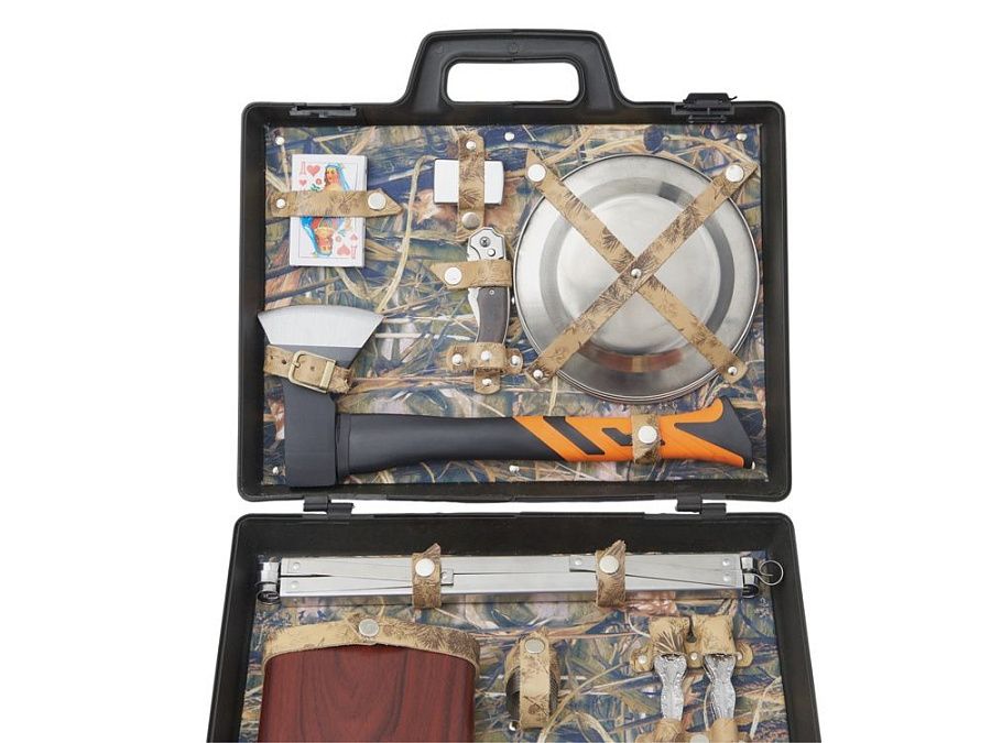 Все аксессуары упакованы в пластиковый кейс и надежно закреплены ремешками из натуральной кожи, что обеспечивает удобство транспортировки и сохранность содержимого.