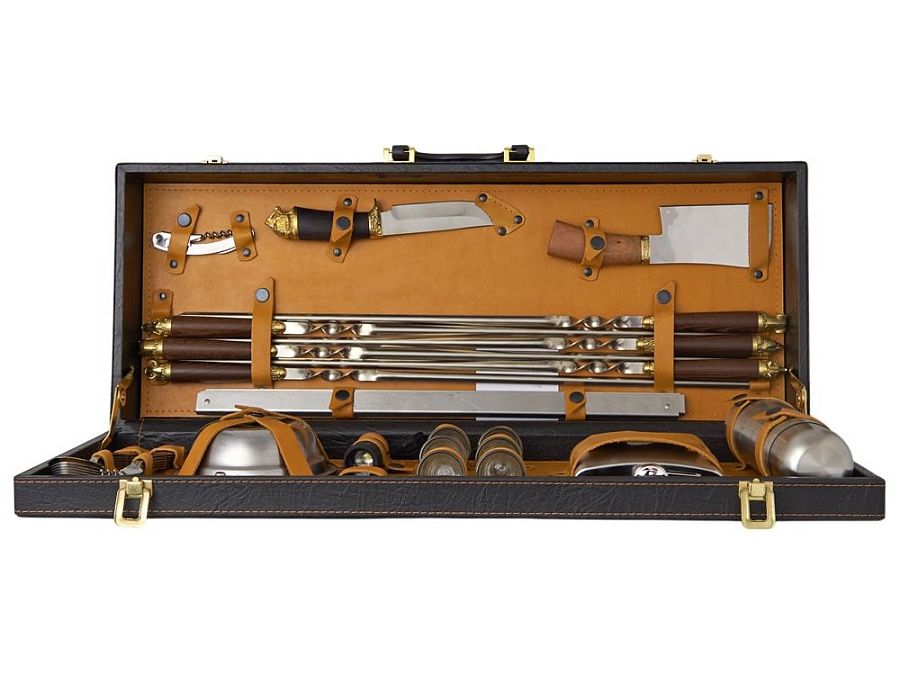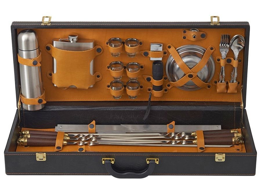 стопка- 6шт, термос, фляга, зажигалка, фонарь, тарелка-6шт, вилка-6шт, ложка-6шт, воронка, ножки для мангала-2шт, шампур-6шт, штопор, нож, нож Топорик