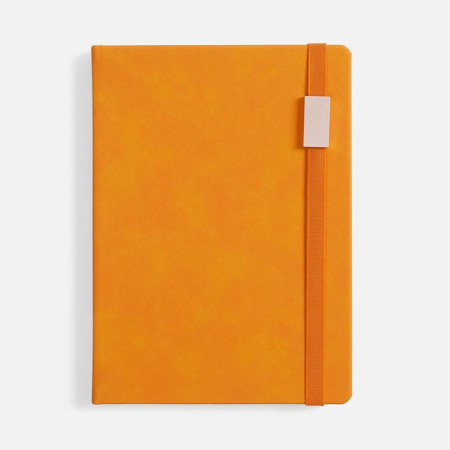 Ежедневник с твердой обложкой, выполнен из материала Nubuck Touch, оранжевый OO, дополнен ляссе в цвет обложки.