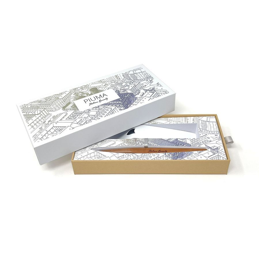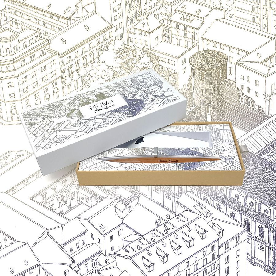 Вечная ручка Pininfarina Piuma Флоренция из лимитированной коллекции дизайнеров Pininfarina в сотрудничестве с Francesco Corni Foundation, посвященной красоте Италии и представленной 8 городами. Франческо Корни - выдающийся дизайнер из Модены, посвятивший свою жизнь популяризации истории и архитектуры. Используя трехмерное перспективное видение, он изучает наиболее значимые здания каждого города, выбирает наилучшую точку обзора, чтобы подчеркнуть их особенности, и прорисовывает детали в древней технике калиграфии. Дополняет видение мастера умелое использование цветов, по одному для каждого города. Для Флоренции дизайнер выбрал центром композиции Corridoio Vasariano, идущий от Palazzo Vecchio до Palazzo Pitti, и фиолетовый цвет, в результате подарочная коробка c ручкой Pininfarina PIUMA становится произведением искусства. PIUMA - ручка динамической формы в виде гусиного пера. Дизайнеры вдохновлялись Кодексом о полете птиц мастера Леонардо да Винчи, целью которого было понять тайну полета и который хранится сейчас в Королевской библиотеке Турина. Piuma находится в постоянном равновесии со своим центром тяжести благодаря белому стальному пьедесталу. Вечная ручка имеет необычный пишущий узел в виде наконечника Ethergraf®, изготовленного из сплава металлов по запатентованной технологии. Он не содержит свинец и алюминий, производится вручную итальянскими мастерами и практически не расходуется за десятилетия использования. При соприкосновении с поверхностью бумаги, происходит химическая реакция и наконечник оставляет серебристый след, который напоминает цвет графитового карандаша, но обладает большей стойкостью. Идеально пишет на каменной бумаге. На ручке стильный логотип Italian Beauty, она полностью сделана из дерева груши. Набор упакован в белую подарочную коробку.