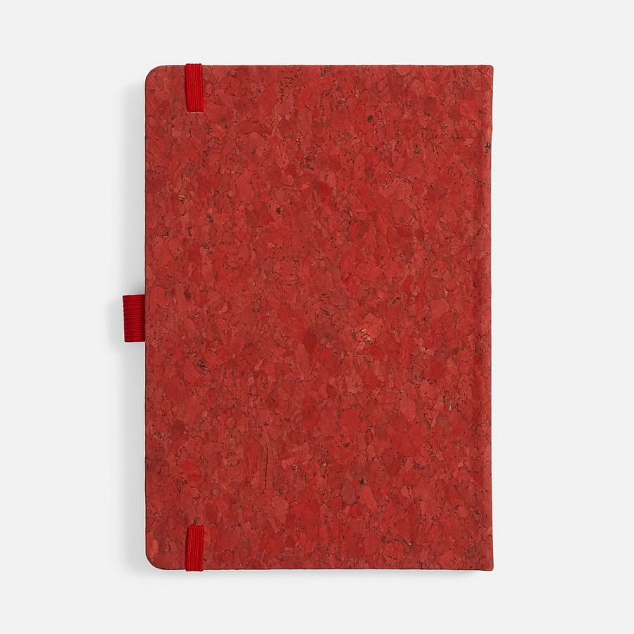 Блокнот с твердой обложкой из натуральной окрашенной пробки, дополнен петлей-резинкой для ручки, ляссе и резинкой в цвет обложки.