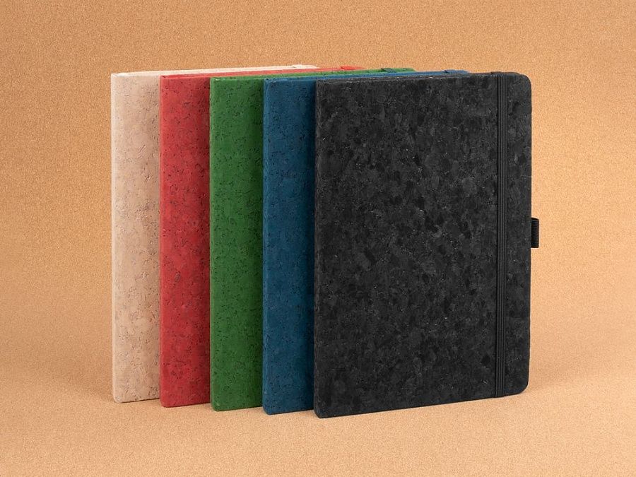 Блокнот с твердой обложкой из натуральной окрашенной пробки, дополнен петлей-резинкой для ручки, ляссе и резинкой в цвет обложки.