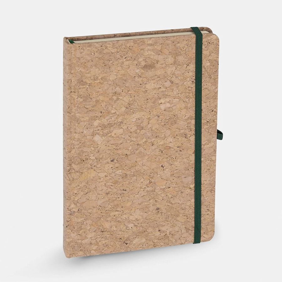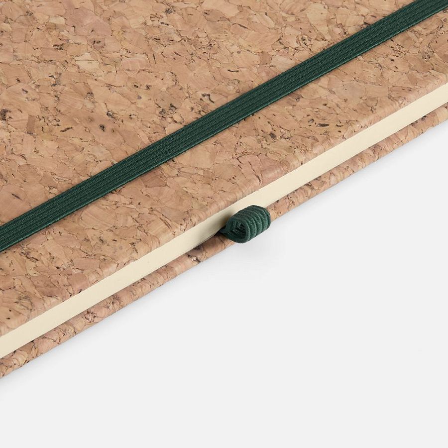 Блокнот в твердой обложке из натуральной неокрашенной пробки, дополнен цветными петлей-резинкой для ручки, ляссе и резинкой на обложку.