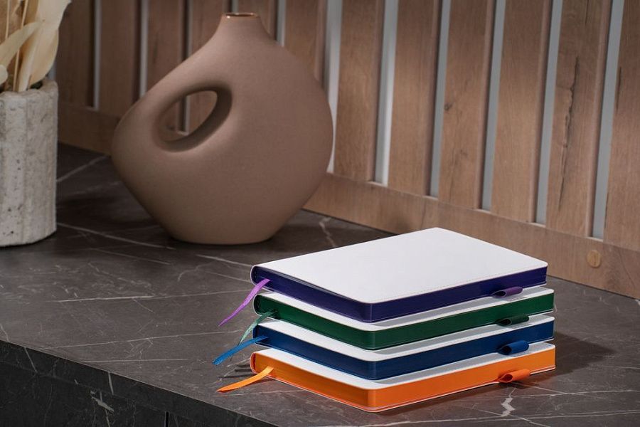 Гибкая обложка, материал обложки — Soft Touch, белый BB и Latte, зеленый FF; материал петли для ручки — Nice Touch, зеленый FF. Срез обложки окрашен в зеленый цвет.