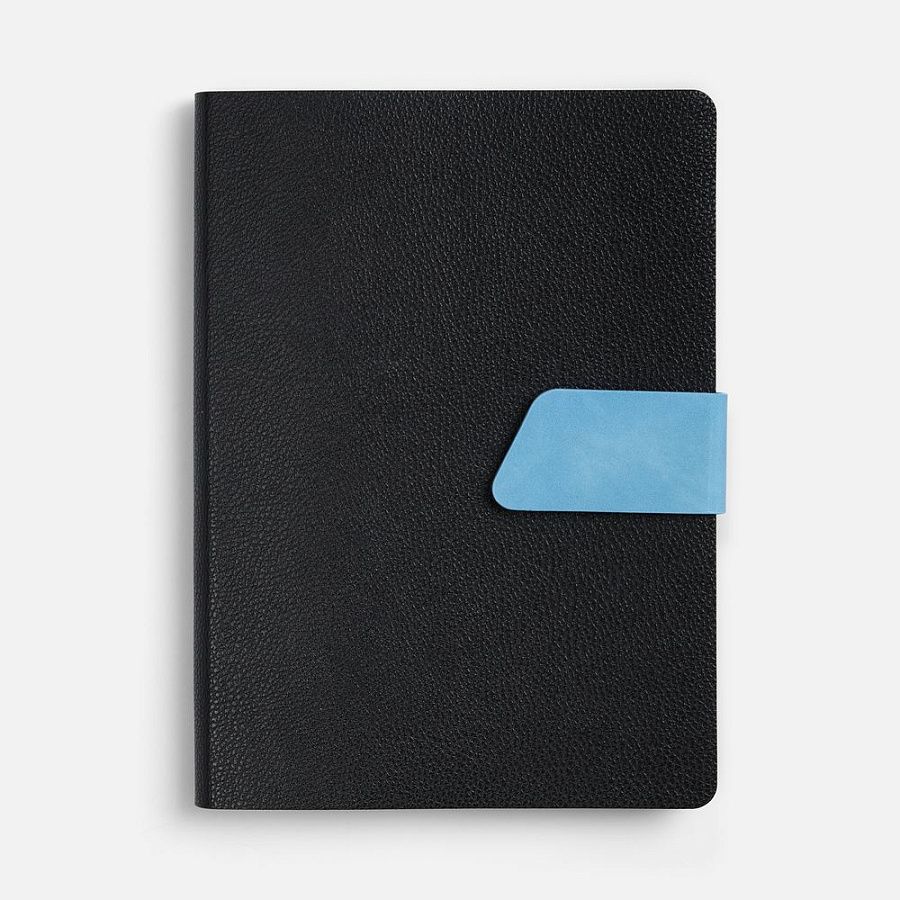 Ежедневник с гибкой обложкой, выполнен из материала La Fite, черный АА и Nubuck Touch, голубой, дополнен голубым ляссе и хлястиком на кнопке.