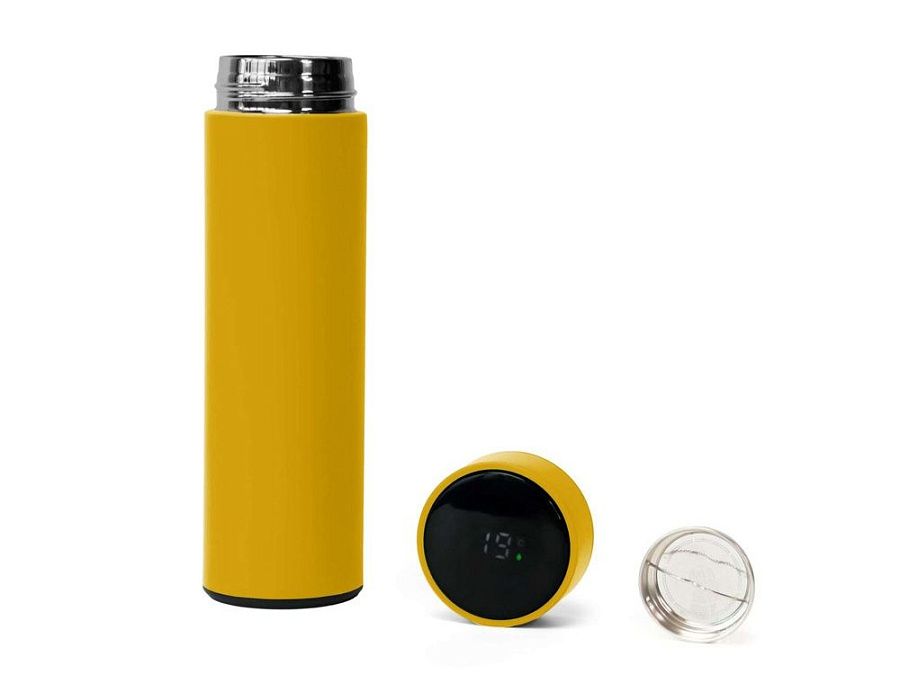 Термос выполнен из нержавеющей стали и покрыт цветным soft-touch покрытием. Его особенность — инновационная крышка со встроенным термометром и LED-дисплеем, который отображает температуру напитка внутри.