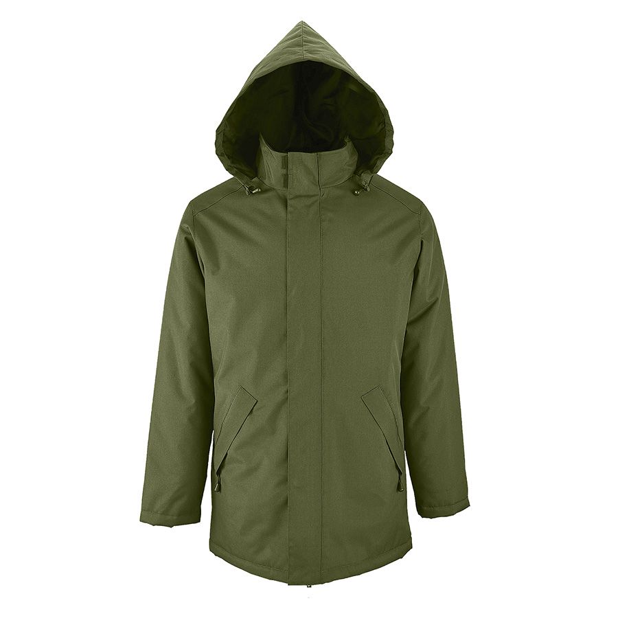 Куртка-парка унисекс на стеганой подкладке ROBYN 170Основная ткань «оксфорд»: 100% полиэстер с водоотталкивающей пропиткойСтеганая подкладка: 100% полиэстерУтеплитель: 100% полиэстер, 170 г м2 Температурный режим определяется в зависимости от индивидуальных особенностей человека. Куртка на тонком утеплителе рассчитана на евро-зиму (от 0 до -10 С)Стильная теплая парка унисекс прямого кроя станет необходимой в промозглое осенне-зимнее время года. Благодаря пропитке ПВХ - (PVC) поливинилхлорид, ткань полностью прорезинена внутри, что делает ее водонепроницаемой и формоустойчивой. Куртка на застежке-молнии с двумя пуллерами для удобства открытия и планкой на скрытых кнопках надежно убережет от попадания ветра и влаги. Внутренняя планка на верхней части куртки обезопасит от прищемления молнией при закрытии. Высокий воротник- стойка (7 см) с внутренней стороны отделан флисом для мягкости и комфорта, а снаружи прячет в себя капюшон на кулиске с резинкой и стопером. Капюшон без утеплителя всегда можно легко достать и разложить, если погода резко испортится, а потом также убрать. Длинные рукава с утеплителем внутри и на застежке-липучке помогут сохранить тепло. 2 внешних кармана на молнии и один внутренний на застежке-липучке уберегут небольшие предметы от намокания. Изнутри на стеганной подкладке внизу имеется технологический карман для удобства персонализации. Упакована куртка в прозрачный фирменный пластиковый пакет Sol's.Цвет близкий к PANTONE 7762 С