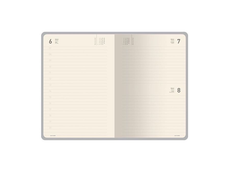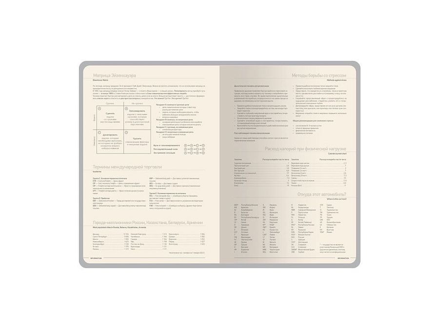 Внутренний блок выполнен из бежевой бумаги плотностью 70 г/кв.м и содержит 14 страниц справочной информации, а также датированные страницы с почасовой разметкой.