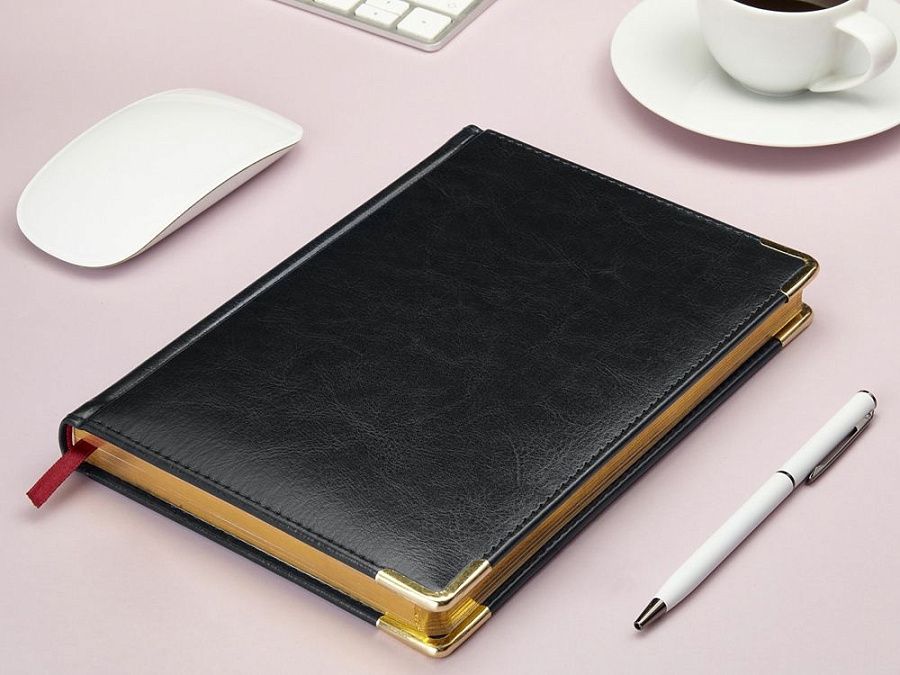 Благородство и статусность придают ежедневнику отстрочка по периметру в тон, скругленные углы, закладка-ляссе бордового цвета, золотой срез.