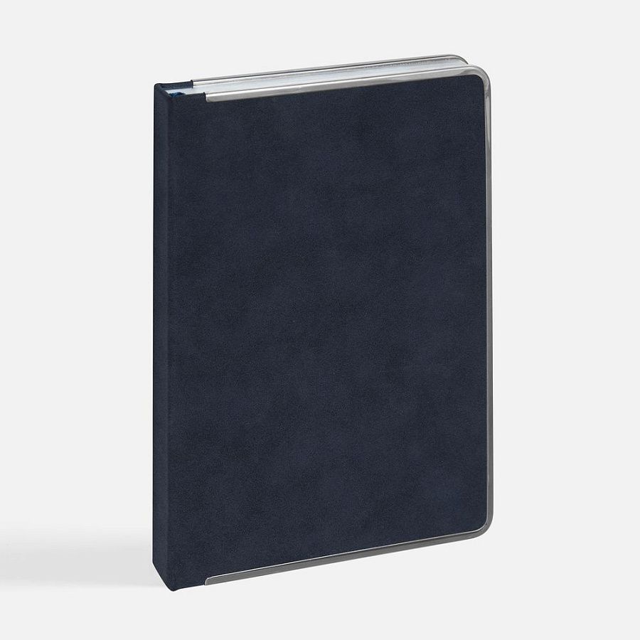 Ежедневник с твердой обложкой и серебристым обрезом блока. Выполнен из материала Nubuck, темно-синий ХХ, дополнен синим ляссе и металлическими рамками с двух сторон обложки.
