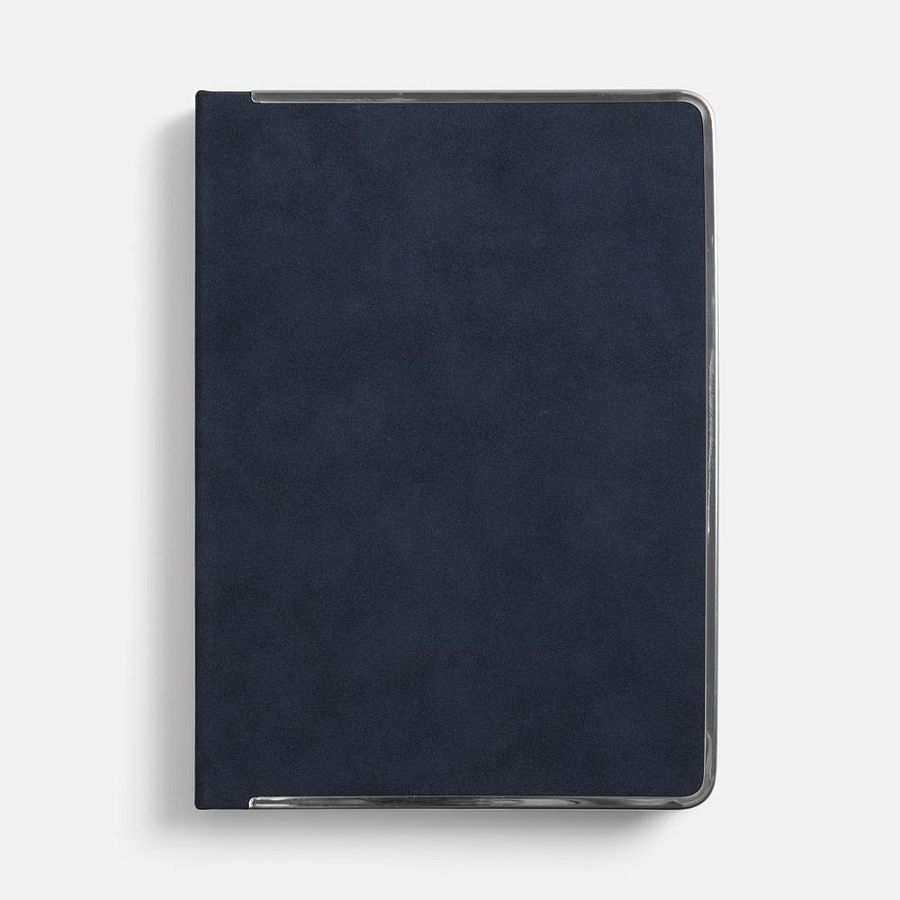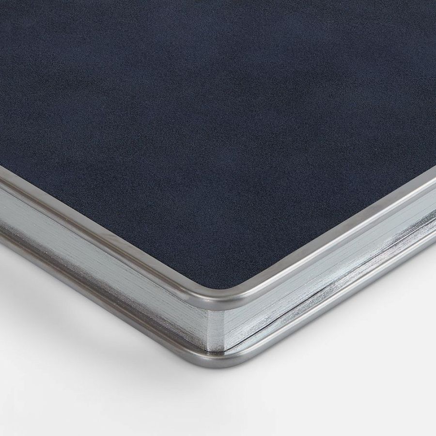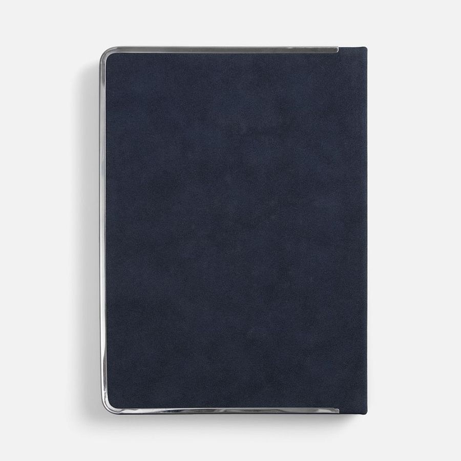 Ежедневник с твердой обложкой и серебристым  обрезом блока. Выполнен из материала Nubuck, темно-синий ХХ, дополнен синим  ляссе и металлическими рамками с двух сторон обложки.