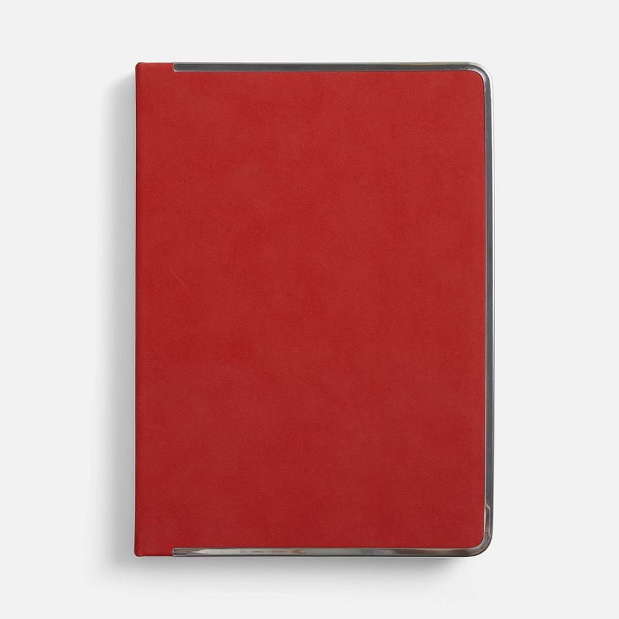 Ежедневник с твердой обложкой и серебристым обрезом блока. Выполнен из материала Nubuck, красный РР, дополнен красным ляссе и металлическими рамками с двух сторон обложки.