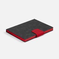 Ежедневник с твердой обложкой, выполнен из материала Nubuck Touch, черный АА, дополнен капталом, ляссе и обрезом красного цвета. Застежка — хлястик на магните из материала Nubuck Touch, красный РР.