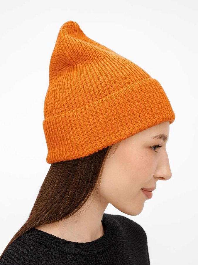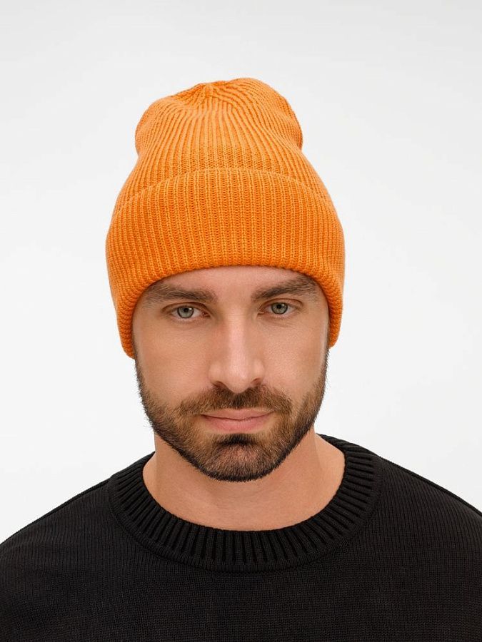 Однослойная шапка фактурной вязки с отворотом.