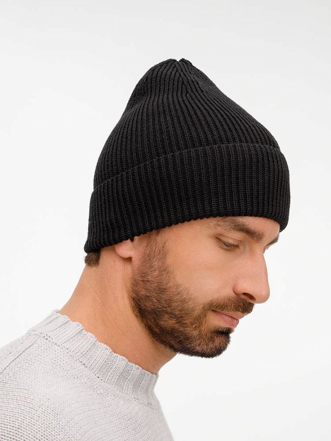 Однослойная шапка фактурной вязки с отворотом.