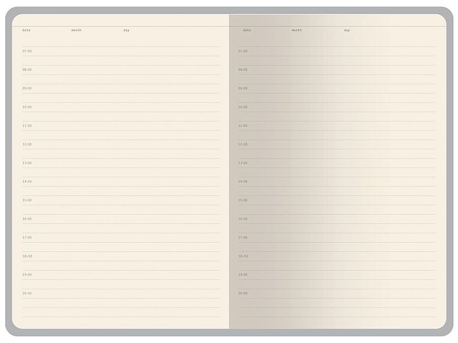 Бумажный блок, закрепленный книжным переплетом, выполнен из бежевой офсетной бумаги плотностью 70 г/ кв м. Внутри блока есть страница для персональных данных, справочная информация на 13 страницах. Блок для записей имеет линовку с указанием временных интервалов в один час.