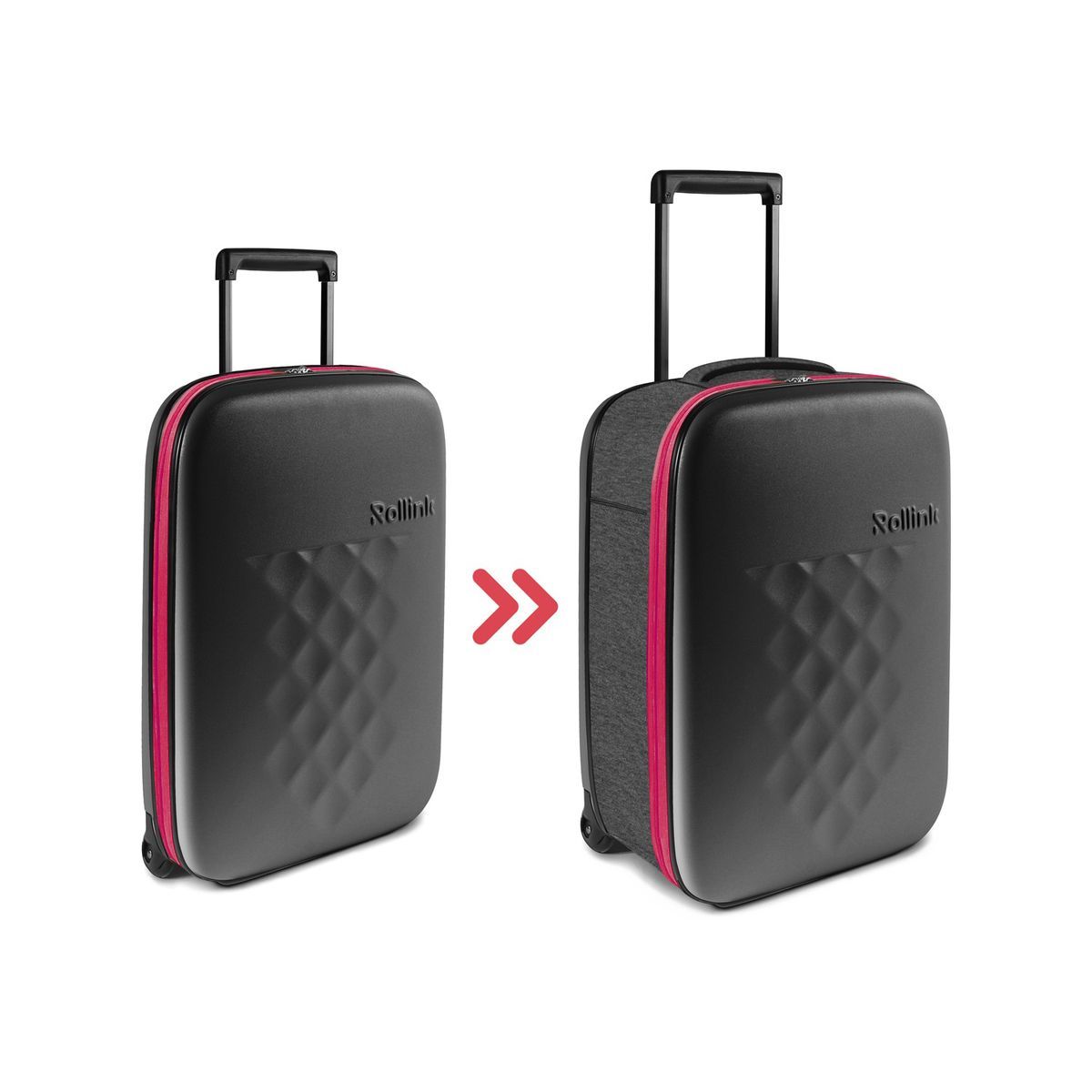 Складной легкий чемодан Rollink Earth черного цвета с красной молнией. Размер 55х40х20 см. В сложенном виде толщина составляет 5 см, с колёсами 8,5 см. Объем 40 л. Вес 2,2 кг. Жесткие стенки сделаны из ударопрочного полипропилена. Бока мягкие, из полиэстера с водоотталкивающей пропиткой. Внутри два откидывающихся жестких клапана на дне и вверху чемодана, крепятся липучками и сохраняют форму чемодана в собранном виде. Боковой easy access карман 12х19 см на липучке для документов и телефона. Удлиненная надежная выдвижная телескопическая ручка из алюминия с несколькими уровнями фиксации высоты ручки (от пола 80/94/104 см) для людей разного роста и удобная мягкая ручка сверху чемодана, чтобы было удобно нести его в руках. 2 колеса со специальным покрытием и подшипниками для более плавного и бесшумного передвижения. Надежная молния красного цвета.
