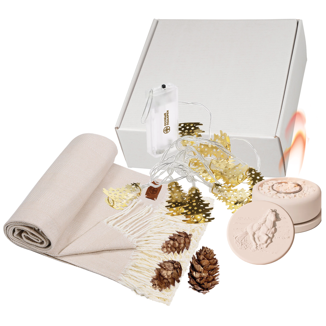 Погрузитесь в атмосферу релакса с нашим подарочным набором. Мягкий хлопковый плед словно обнимает теплом, а биокамин создает мягкое пламя, наполняя пространство уютом и спокойствием. Гирлянда добавляет волшебства и нежных огоньков, превращая любой вечер в особенное событие.