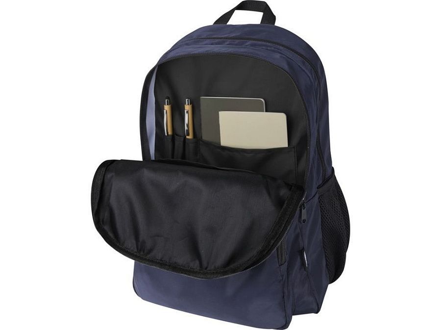 Рюкзак Trend Plus изготовлен из сертифицированной согласно GRS переработанной мягкой и немнущейся ткани и качественной подкладки из RPET. Рюкзак оснащен отделением для ноутбука диагональю 15", отделением-органайзером, передними карманами на молнии, боковыми эластичными сетчатыми карманами и сетчатой вентилируемой задней частью с лямкой для крепления к ручке чемодана. Регулируемые плечевые ремни для оптимального комфорта при ношении. Объем: 20 литр. Выдерживает вес до 10 кг. Не содержит ПВХ. GRS certified recycled polyester.