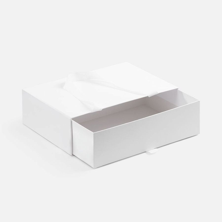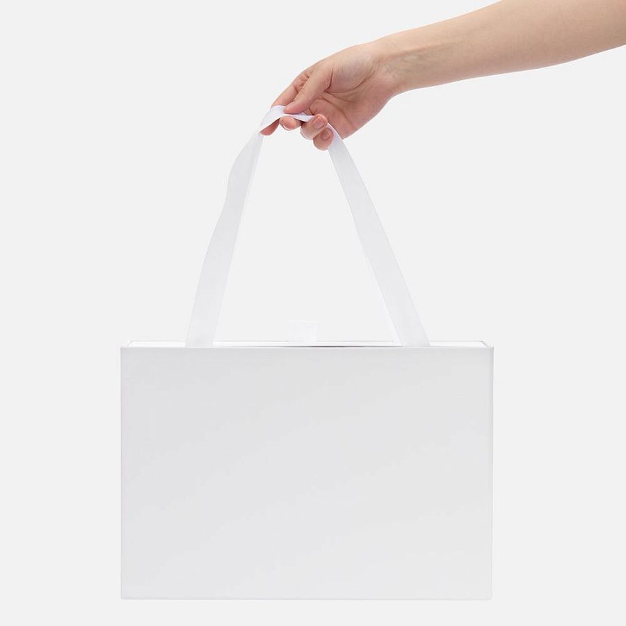 Внешний короб каширован дизайнерской бумаги и оснащен прочными ручками из репсовой ленты. Внутренний короб отделан белой бумагой, ламинированной матовой пленкой.