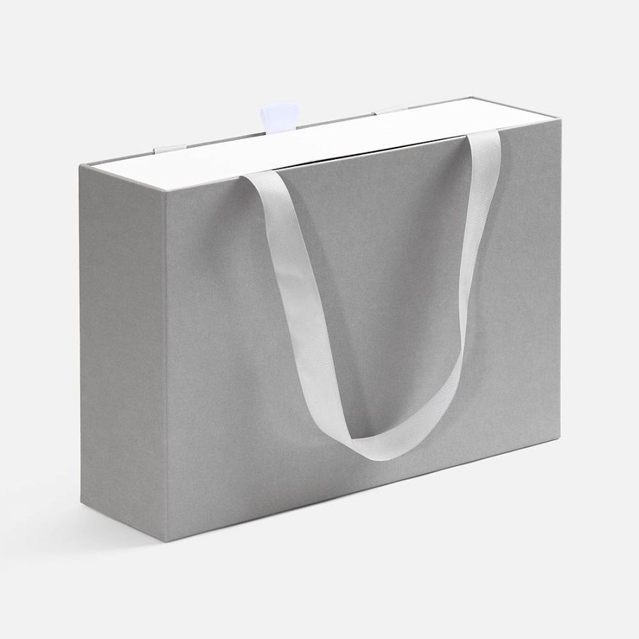 Внешний короб каширован дизайнерской бумаги и оснащен прочными ручками из репсовой ленты. Внутренний короб отделан белой бумагой, ламинированной матовой пленкой.