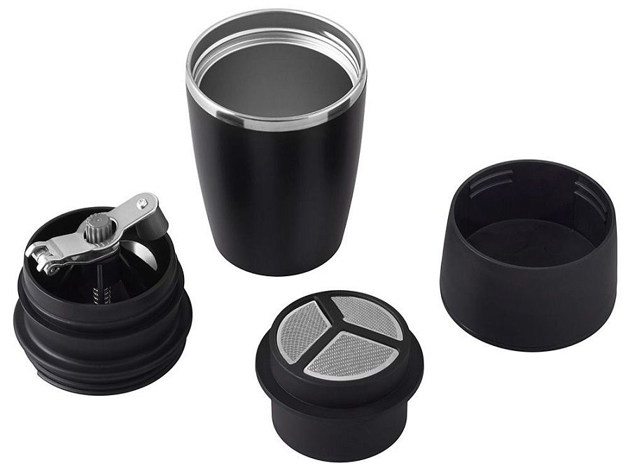 Идеальный корпоративный подарок для тех, кто ценит аромат настоящего кофе и всегда в движении. Эта стильная портативная кофеварка совмещает в себе три функции: ручную кофемолку, капельную кофеварку и термостакан. Всё, что нужно — просто насыпать зерна, помолоть их встроенной кофемолкой, залить кипятком, и свежий напиток готов прямо в термостакане!