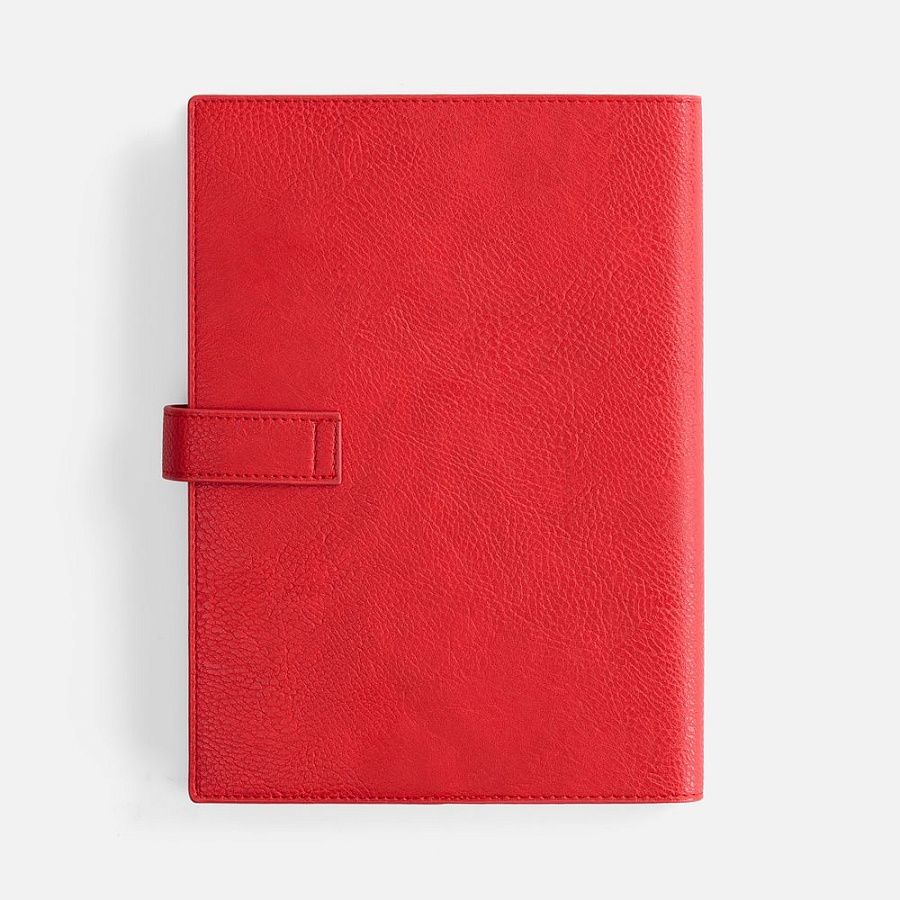 Ежедневник в мягком переплете со съемной обложкой, дополнен застежкой-хлястиком с металлическим шильдом на кнопке, двойным ляссе и капталом.