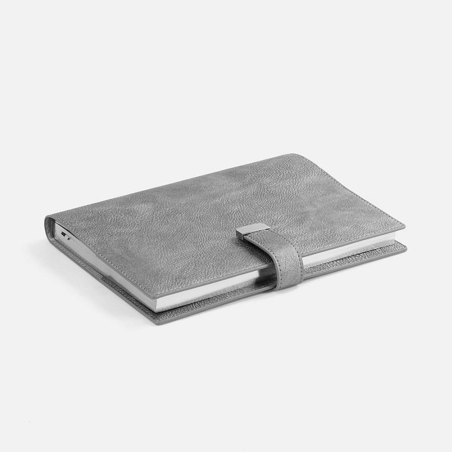 Ежедневник в мягком переплете со съемной обложкой, дополнен застежкой-хлястиком с металлическим шильдом на кнопке, двойным ляссе и капталом.