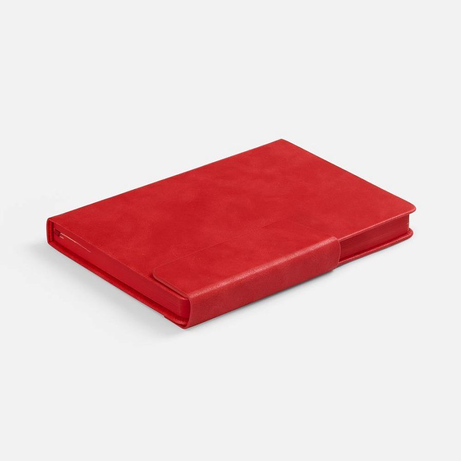 Ежедневник с твердой обложкой и фигурным магнитным клапаном, дополнен капталом и двойным ляссе.