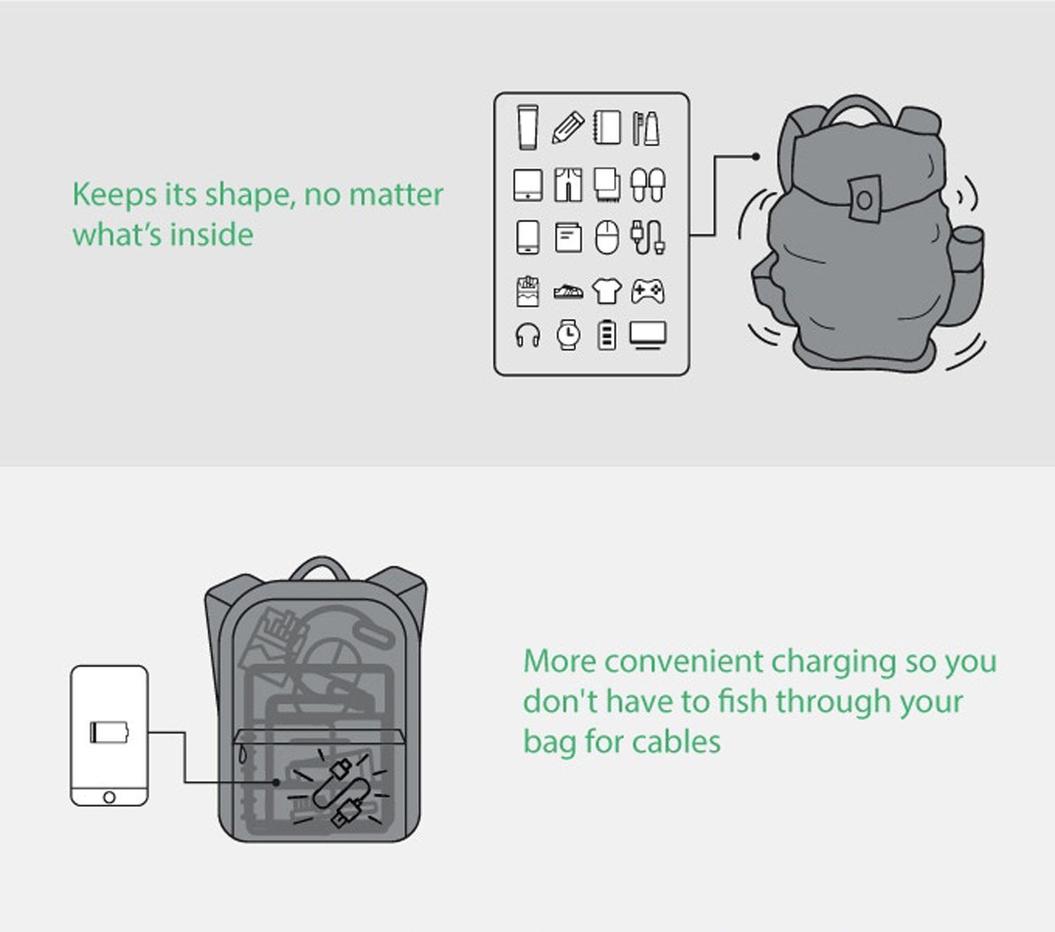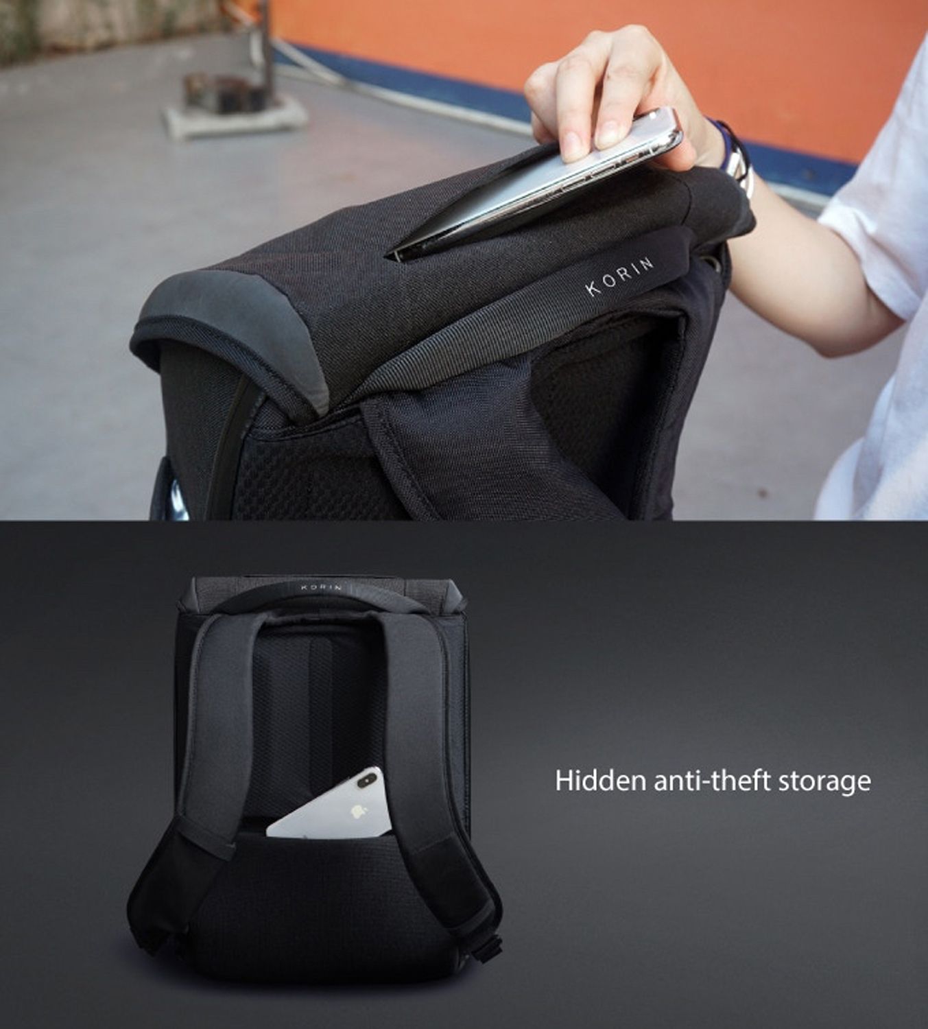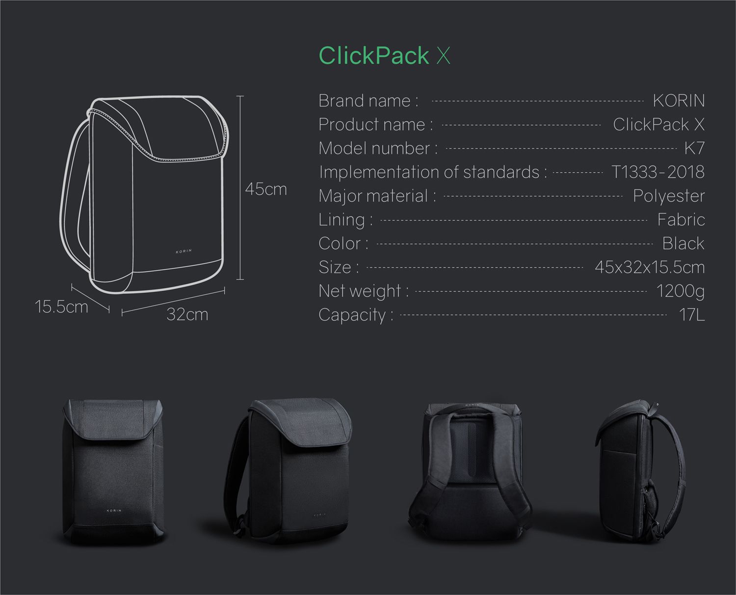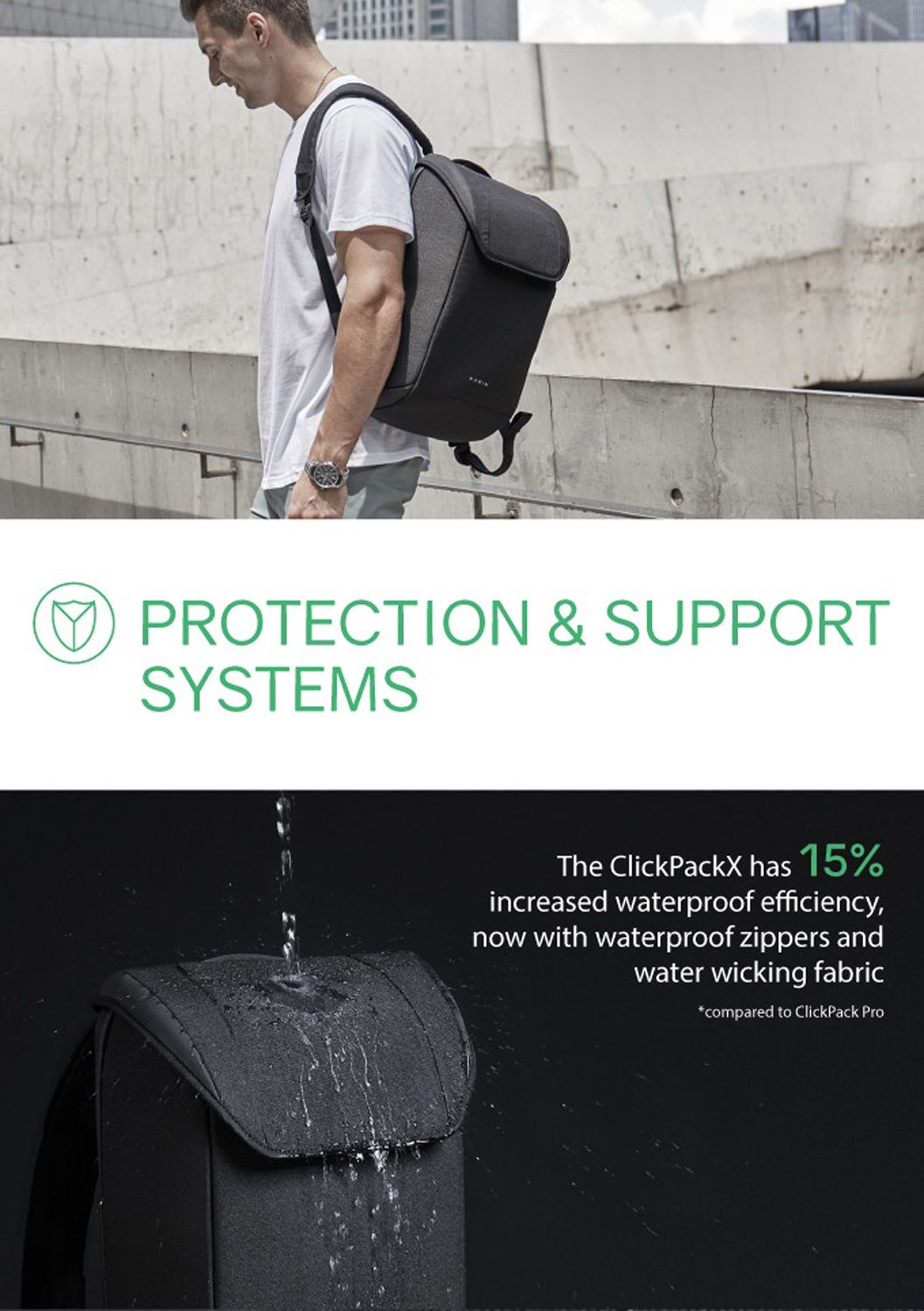 Вместительный городской рюкзак ClickPack X черного цвета, обладатель премии iF Design Award 2020. Размер рюкзака 45х32х15,5 см, объем 18 л, вес 1200 гр. Сделан из свехпрочного устойчивого к порезам и трению водоотталкивающего полиэстера многослойного плетения. Сочетание полиэстера и стекловолокна защищает от порезов ножом или другими острыми предметами. Конструкция достаточно жесткая, не деформируется. Детально продуманная организация отделений позволяет грамотно распределить вес. Самые тяжелые предметы располагаются ближе к спине, например, в отделении размером 34х28х3 см для ноутбука диагональю до 15,6” с дополнительным карманом размером 18х24 см для планшета диагональю до 8” или мелких вещей. Благодаря плотным перегородкам ноутбук надежно фиксируется и не перемещается при ходьбе. Специальная анатомическая конструкция снижает нагрузку на плечи и спину, и вес рюкзака воспринимается на 20-25% легче, чем при использовании стандартных моделей рюкзаков. Вентилируемая спинка с мягкими анатомическими вставками и дополнительной защитой поясничного отдела позвоночника. Конструкция рюкзака позволяет открывать его под углом 30° или распахнуть полностью на 180°. Если необходимо достать какие-то мелочи, достаточно зафиксировать липучки для вертикального открытия на 30°, а для того, чтобы аккуратно уложить в рюкзак много различных предметов, просто положите его и раскройте на 180°. Дополнительно в основном отделении расположены еще 5 карманов различного функционала. 2 кармана размерами 13х22 см и 14х22 см на молниях и 3 открытых кармана под мелочи, в один из которых размером 16х10 см можно поместить powerbank, т к в него приходит USB-кабель, соединенный с портом на внешней стороне рюкзака для легкого подключения к смартфону. Это оригинальная запатентованная система зарядки K EasyCharging 3.0 нового поколения с помощью USB-порта, расположенного в лямке рюкзака, и кабеля, идущего к powerbank, что делает мобильную зарядку более удобной. С внешней стороны рюкзака сбоку есть специальный водозащищенный карман размером 14х11 см. В него можно поместить бутылку с водой или зонт. Рюкзак закрывается на водонепроницаемую молнию YKK, которую можно зафиксировать с помощью кодового замка TSA007 с функцией таможенного досмотра. После этого рюкзак закрывается клапаном, фиксирующимся магнитным замком с системой SNAP. На клапане расположен easy access карман с магнитной застежкой. На правой лямке рюкзака находится USB-порт, на левой - easy access карман для карточек. На обеих лямках с удобной новой системой регулировки и фиксации пряжек есть петельки, за которые можно прицепить очки или проводные наушники. На спинке рюкзака расположен внешний потайной карман на магнитной застежке размером 14х28 см. Над ним есть дополнительная лямка, за которую можно закрепить рюкзак на выдвижной ручке чемодана. В дополнение к вышеперечисленным средствам защиты рюкзак ClickPack X оснащен стальным тросом, которым можно обхватить неподвижный предмет и затем зафиксировать бегунком молнии в кодовом замке. Сверху расположена специальная ручка, за которую при необходимости удобно нести рюкзак в руках. На углах клапана рюкзака размещены треугольные светоотражающие элементы черного цвета, отлично вписывающиеся в основной дизайн. В темное время суток они равномерно отсвечивают практически на 360° и делают вас заметными на расстоянии до 100 метро