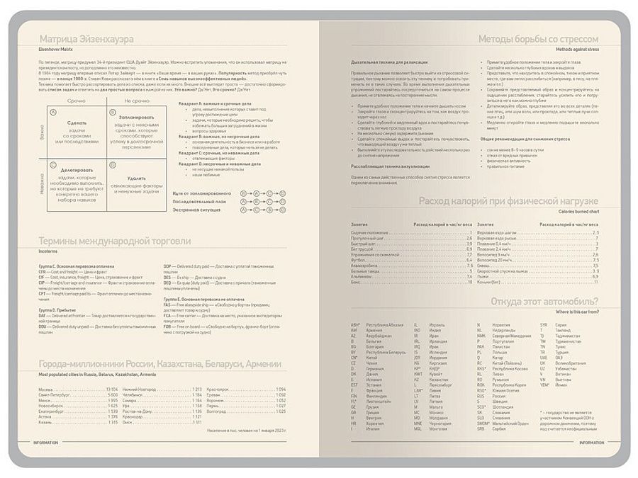 Недатированные страницы в серую линейку имеют отдельное место для проставления числа месяца и дня недели. Справочный блок на 17 страницах содержит полезную информацию из различных областей.