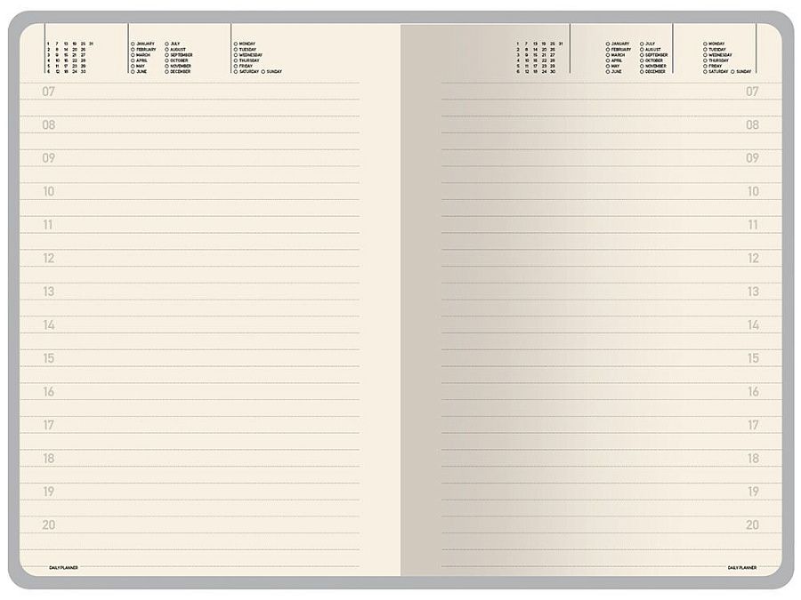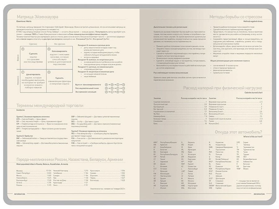 Недатированные страницы в серую линейку имеют отдельное место для проставления числа месяца и дня недели. Справочный блок на 17 страницах содержит полезную информацию из различных областей.