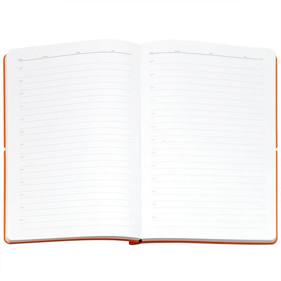Ежедневник с гибкой обложкой выполнена из материала Nice Touch, оранжевый и Latte, оранжевый (внутренняя часть обложки), дополнен горизонтальной резинкой в цвет обложки. Внутри корешка — специальное место для крепления ручки размером до 15х1 см.