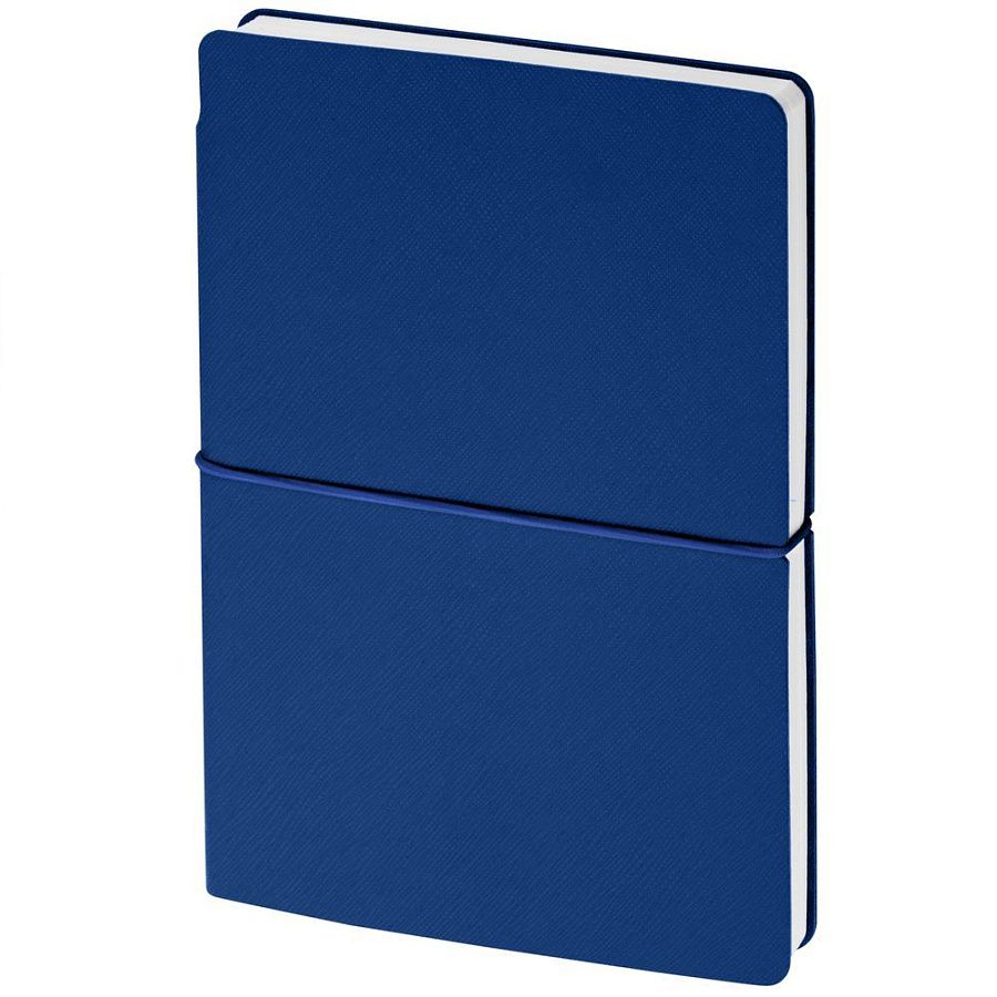 Ежедневник с гибкой обложкой выполнена из материала Nice Touch, синий и Latte, синий (внутренняя часть обложки), дополнен горизонтальной резинкой в цвет обложки. Внутри корешка — специальное место для крепления ручки размером до 15х1 см.