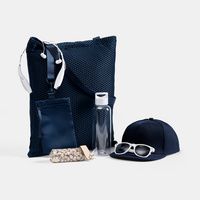 шопер - полиэстер, твил 290d с полиуретановой пропиткой; трехслойная сетка; наушники, очки - пластик; бейсболка - полиэстер 100%, плотность 300 г/м²; бутылка - пластик, ПЭТ