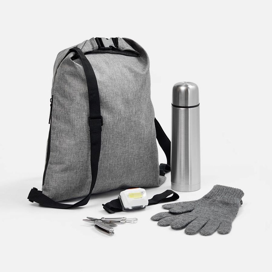перчатки - шерсть 50%; акрил 50%; мультитул - алюминий, нержавеющая сталь; фонарь - пластик; рюкзак - полиэстер, 300d; термос - нержавеющая сталь, 304 внутри, 201 снаружи; пластик