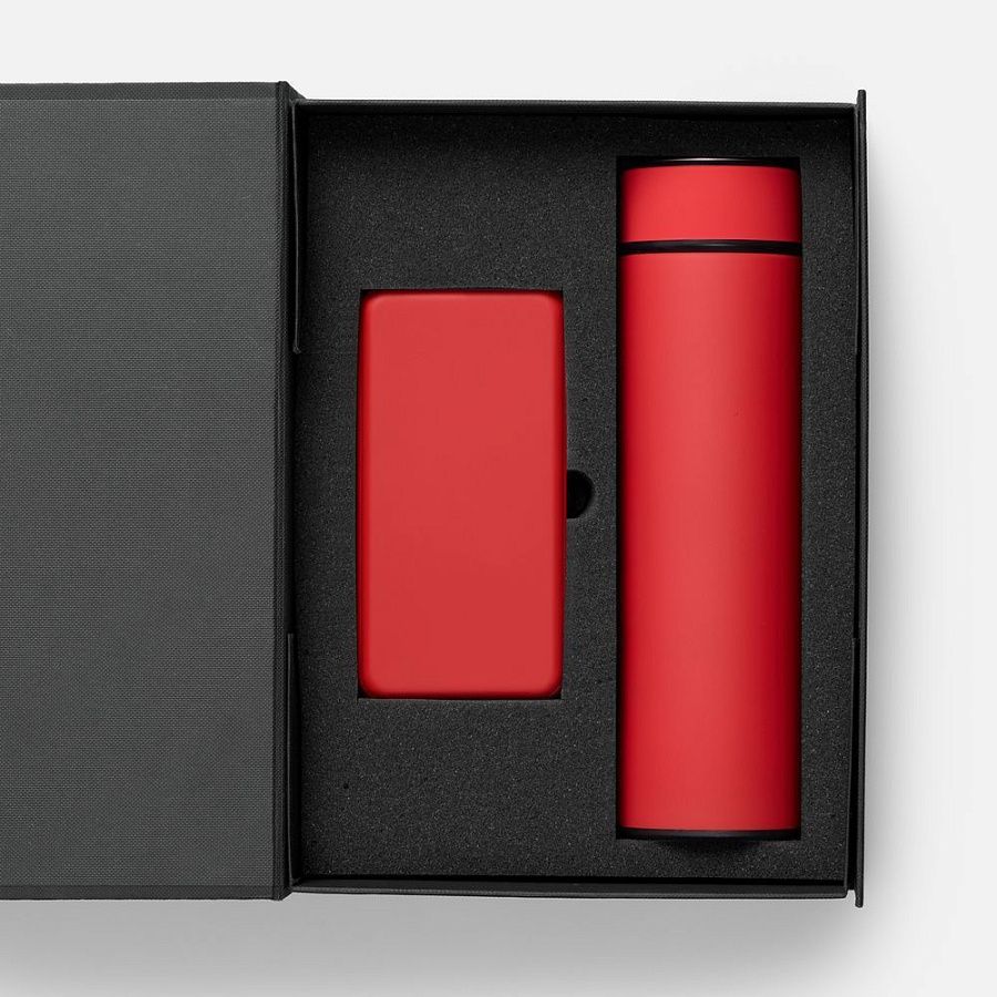 аккумулятор - пластик; покрытие софт-тач; термос - нержавеющая сталь, 304; покрытие софт-тач; коробка - переплетный картон