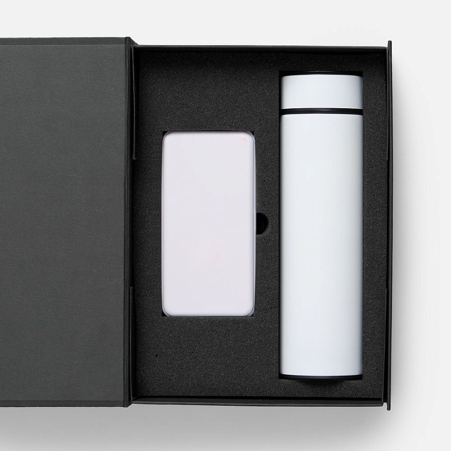 аккумулятор - пластик; покрытие софт-тач; термос - нержавеющая сталь, 304; покрытие софт-тач; коробка - переплетный картон
