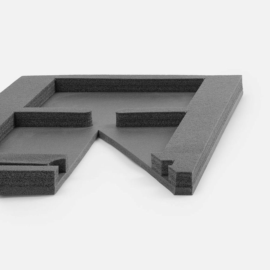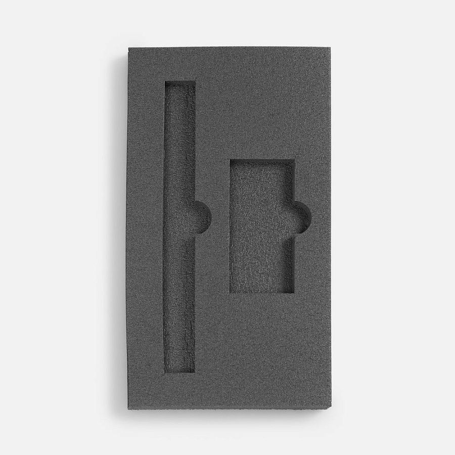 Ложемент, изготовленный из материала Izolon 500 черного цвета, представляет собой многослойную конструкцию, состоящую из нижнего слоя толщиной 5 мм и верхнего слоя толщиной 10 мм. В соответствии с утвержденным макетом, проемы для размещения предметов могут быть спроектированы как в одном, так и в обоих слоях.