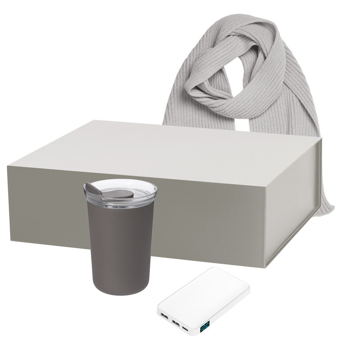 В наборе нём объединены три незаменимых аксессуара для поддержки уюта и комфорта в любых условиях: внешний аккумулятор, шарф и термокружка.