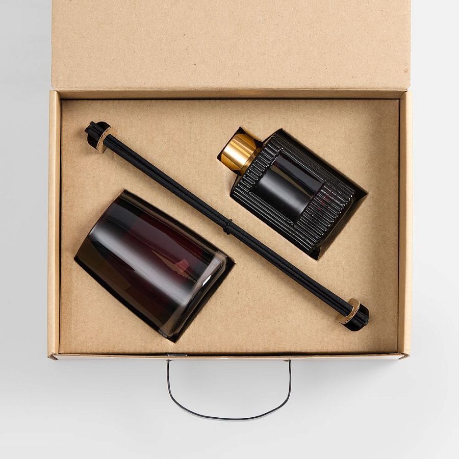 флакон, подсвечник - стекло, палочки из файбера; свеча - воск; коробка - микрогофрокартон