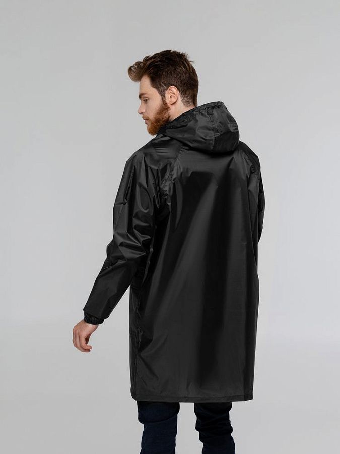 Плащ–дождевик на молнии с капюшоном и рукавами реглан. Ветрозащитные манжеты на рукавах.