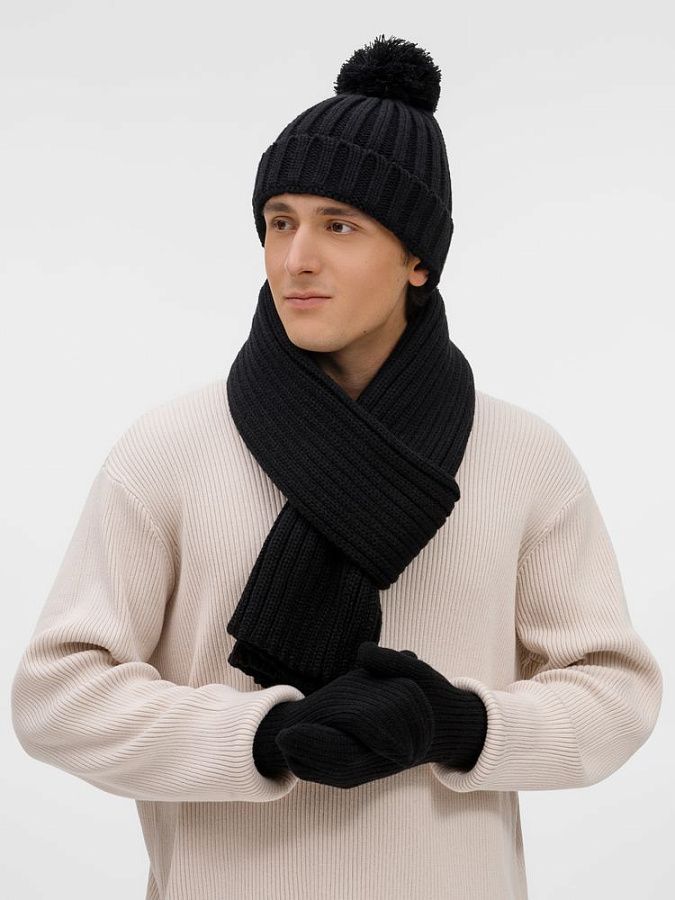 Шапка с пышным помпоном и отворотом, связанная крупной резинкой, создает игривый силуэт, а широкий шарф с выразительной текстурой надежно защищает от ветра, сохраняя свободу движений. Варежки с отворотом-резинкой плотно облегают запястье, не пропуская холод.