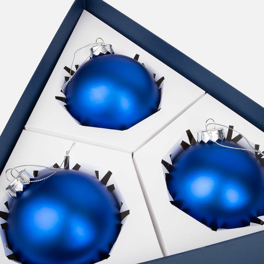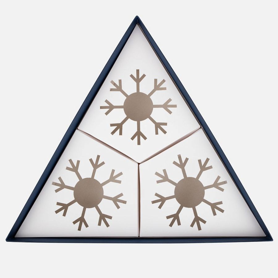 А еще Finery Trio — это маленькое произведение искусства, созданное с вниманием к деталям: шары диаметром 10  см бережно уложены в индивидуальные ложементы с изящным вырезом в форме снежинки, а стильная коробка придает подарку особую торжественность. Нестандартная треугольная форма упаковки подчеркивает оригинальность композиции и делает презент по‑настоящему запоминающимся.